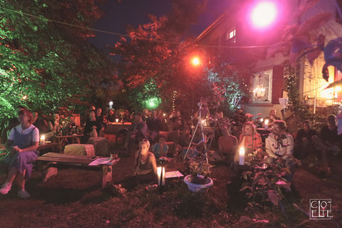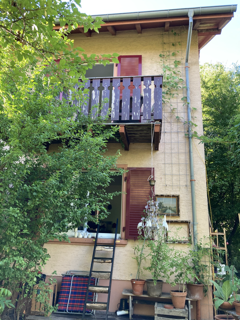 Nostalgischer Hausteil mitten im Grünen, umgeben von Bäumen und den Kunstateliers der FABRIKculture Hegenheim.